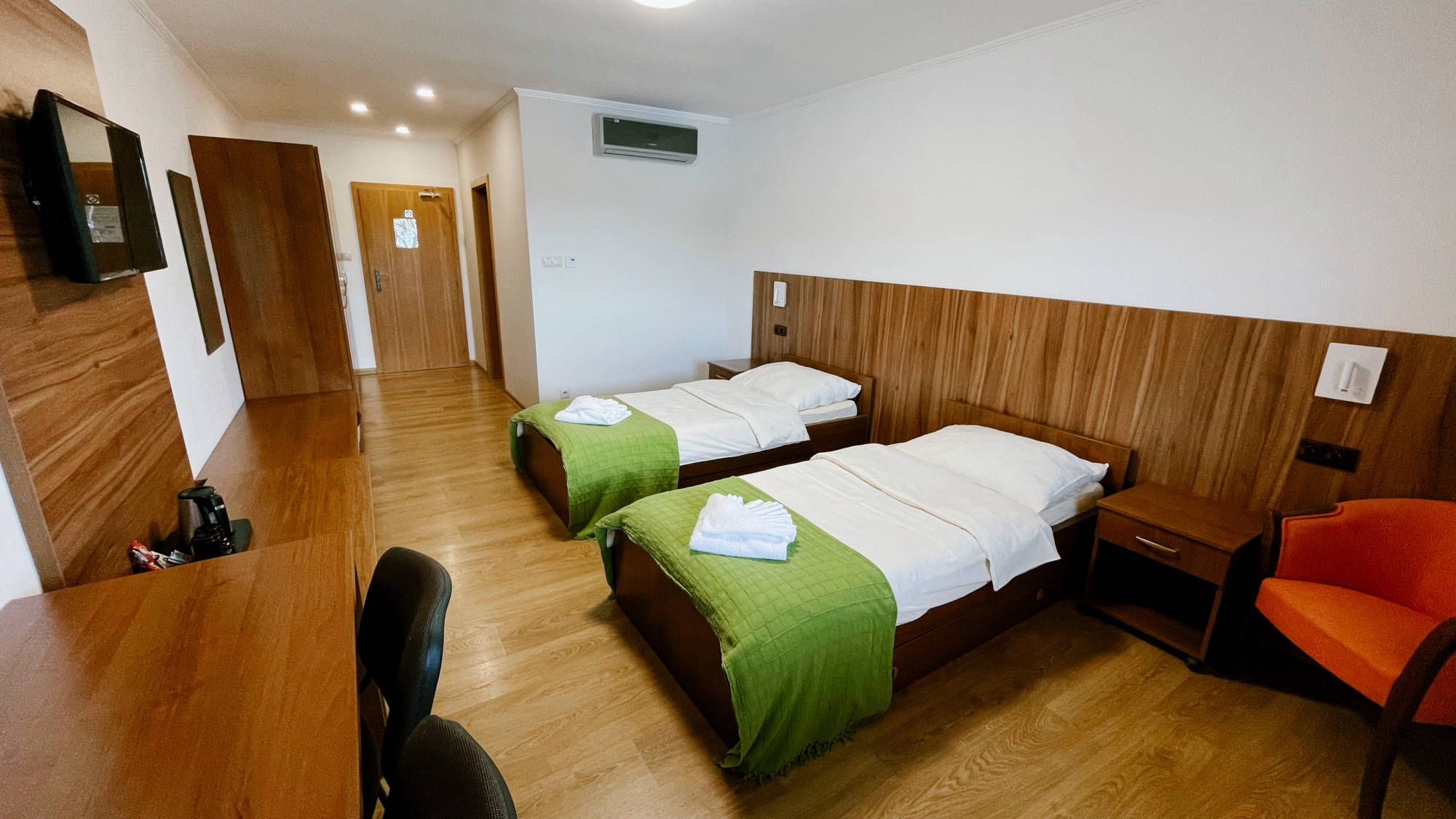 V izbách "STANDARD" je plusom klimatizácia, konferenčný stolík s kreslami, káva, čaj a celkovo väčší ubytovací a úložný priestor.